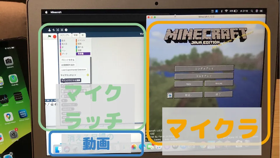 - MacBookAir→マイクラッチのプログラミング画面、Minecraft JAVA版画面の2分割