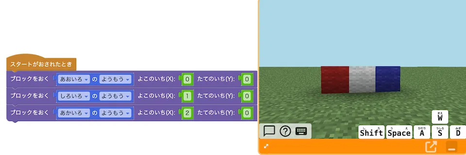普通の勉強であれば、「まだ習ってないからやらない!」となってしまいますが、マイクラッチなら「青、白、赤の羊毛ブロックを順番通りに置く」ことを通して、楽しく直感的に理解できます。