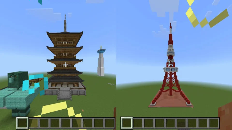 マイクラでは五重の塔とか近くの街を作ったよ。